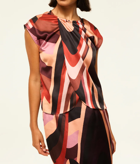 Jessie is a cap sleeve high neck top cut from our Canyon Stripe satin. Featuring a high neckline and crossover front detail. Pair this style with jeans or with the coordinating Franco skirt for a chic fall set.