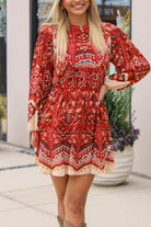 The Sand Ainika Pineapple Tapestry Long Sleeve Mini Dress enchants with its rich tapestry-inspired print in warm, earthy reds and creams. Designed with a high neckline and a gently cinched waist, it shapes a playful, flowing silhouette. Delicate button details and subtle scalloped trim at the shoulders add a touch of charm. This dress invites you to embrace comfort while radiating a cozy, artistic spirit.