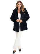 Elsa faux fur coat, lapel collar, hidden hook & eye closure, slit pockets on front, hem lands on mid thigh, ribbon trim detail at bottom hem of lining, relaxed fit.