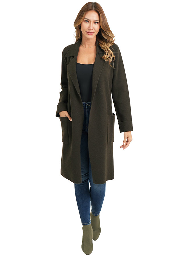 Open front tailored oversized cardigan, notched collar, front patch pockets, wide folded back sleeve cuffs, straight fit.