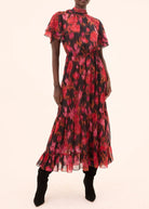 Safiya is a maxi-length version of our best-selling Saffie mini dress. Cut from vibrant red Blur Flora printed chiffon, it features a high mock neckline with a back tie closure and short double ruffle sleeves. Fully double lined, the flowing tiered skirt is finished with a ruffle hem and an elasticated waist for effortless comfort. The perfect dress to take you from fall to winter, it pairs beautifully with everything from heels to suede boots.