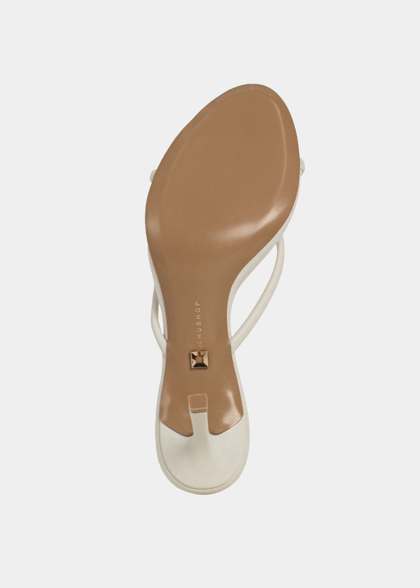Timeless with a twist. Heidi White reinvents the classic thong sandal with a sleek kitten heel and softly knotted straps in a clean white hue. Feminine, minimal, and effortlessly cool-this is your new go-to for sunny days and warm nights.