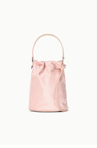 The Lila is a handheld satin evening bag with a drawstring closure. It features a detachable leather shoulder strap.