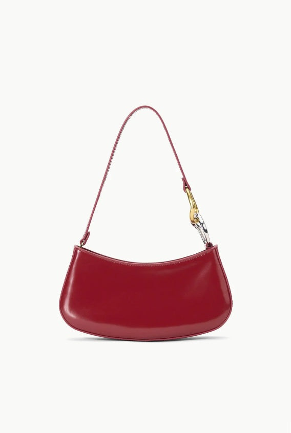 The Ollie Bag is a mini shoulder bag made out of polished leather. This style features a hardware design on the strap and a zip closure.