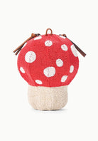 A hand-beaded handheld bag with detachable crossbody strap, the Shroom features a leather-wrapped handle and zipper opening.