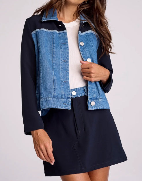 Mixed media perfection: the Hendrix jacket is an update to the classic denim jacket, made from 100% cotton denim and our signature lux gabardine fabric. True to size, Hendrix features a full button closure and raw edge detailing. Create a matching look by pairing it with the Shon skirt.