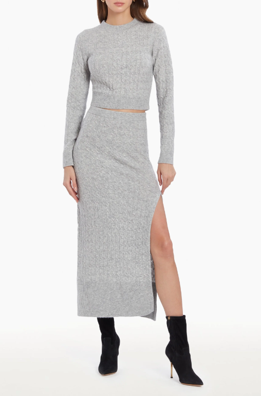 Reimagine sweater-weather in the Isla Skirt, a comfortable staple with a hint of edge. This mid-rise cable knit skirt features a tall slit on the left leg. Ribbed details at the waistband and hem add a polished touch, while the elastic waistband ensures a comfortable, flexible fit. Pair it with the Isla Top to enjoy the fall in this relaxed but elevated set—perfect for staying sleek as the weather cools.