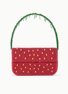 New in for Summer, our latest limited edition Tommy has been updated in a playful strawberry pattern. The Tommy Bag is a hand-beaded shoulder bag with vegan leather piping. This style features beaded fringe on the shoulder strap, a single flap closure, inner zip pouch and a pocket on the back.