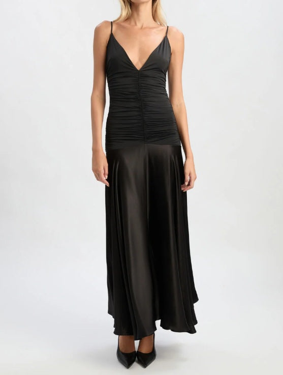 The Lavanda Contrast Maxi Dress merges fluid textures with a sculpted silhouette for striking impact. Designed with a jersey bodice that contours the frame, it features delicate gathers that create dimension and movement. A satin skirt cascades to the floor, capturing light with every step. Modern yet timeless, Lavanda is a study in contrasts, elevated ease paired with dramatic flow.