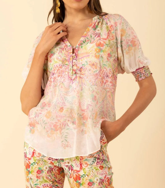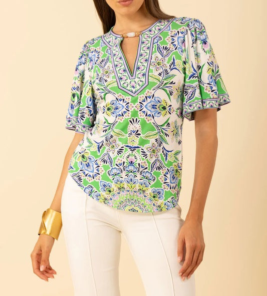 Liverpool Short Sleeve Button Front Blouse - Green/Tan Stripe