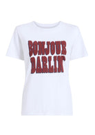 The Bonjour Darlin Tee is a timeless white cotton tee accented with tasteful red lettering, blending charm and comfort effortlessly. Perfectly paired with dark wash jeans, it creates a polished yet relaxed look ideal for everyday sophistication.