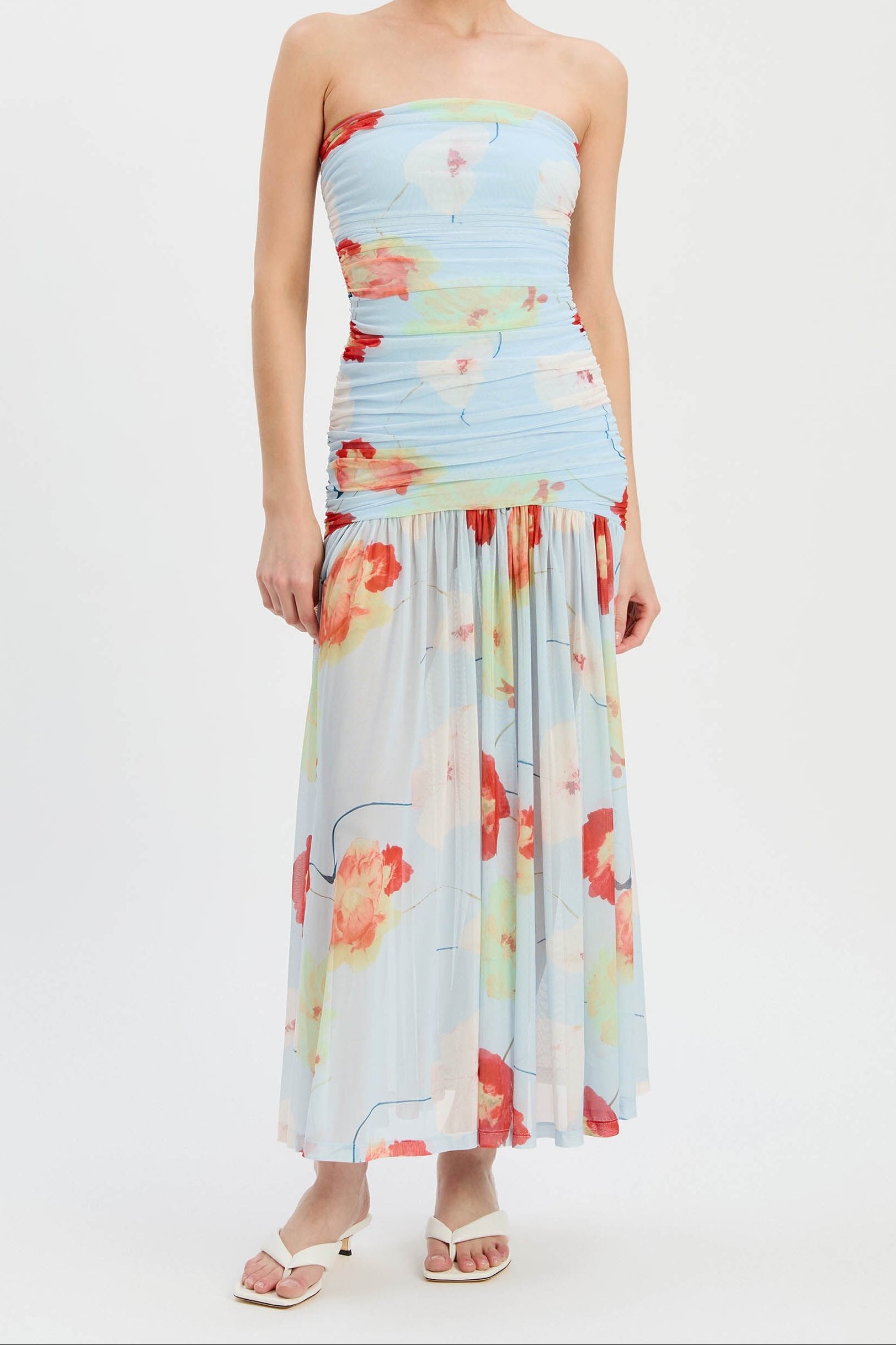The Solana Printed Mesh Maxi Dress in baby blue floral is a statement in effortless femininity. Crafted in mesh, this strapless design features gathered detailing through the body and tail, creating a flattering, fluid shape. Lined through the body for ease, its soft movement and romantic print make it a standout piece for summer days and nights alike.
