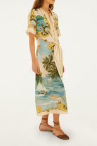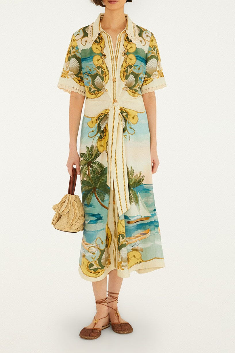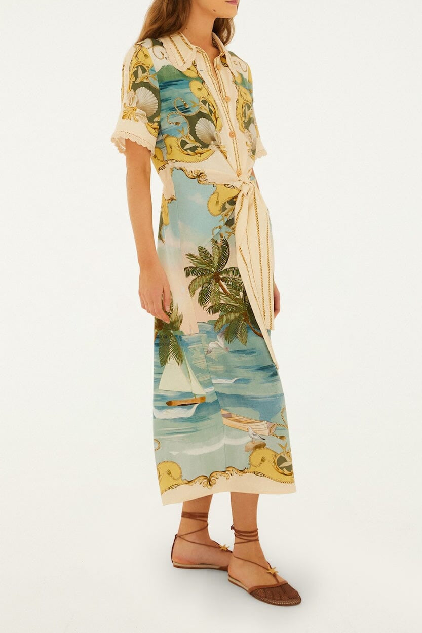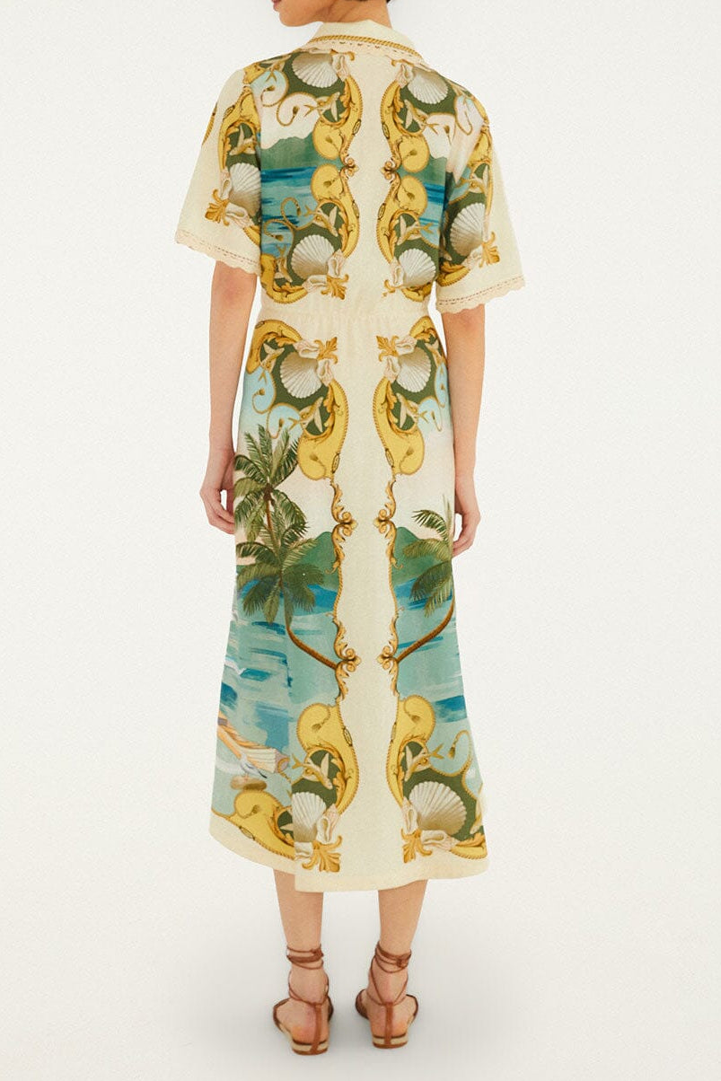Embrace effortless elegance with the Off-White Royal Sea Midi Dress by FARM Rio. Crafted from breathable Lenzing™ Ecovero™ Euroflax™, this dress features a crisp collar neckline that frames the face beautifully. Its off-white canvas is adorned with subtle, nature-inspired patterns that celebrate Brazilian vibrancy. The flattering midi silhouette flows gently, offering movement and comfort while capturing a playful, sun-kissed spirit perfect for any warm day adventure.