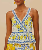 Embrace the vibrant spirit of summer with the Off-White Zuli Sleeveless Blouse by FARM Rio. This playful piece features a V neckline that elegantly complements its sunny floral patterns in cheerful yellows and deep blues. Delicate eyelet lace trims add a touch of whimsy, while the flattering silhouette whispers of sunny days and carefree adventures. Perfect for adding a splash of color and joy to any moment.