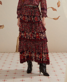 Embrace your love for lush prints with the Purple Chelsea Garden Ruffles Maxi Skirt from FARM Rio. This enchanting piece intertwines shades of purple, muted red, and earth tones into an exquisite botanical and avian pattern. Cascading ruffles add movement and whimsy, while the floor-skimming length brings an air of graceful elegance. Let this skirt be your canvas for memorable moments and spontaneous celebrations.