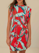 Infuse your wardrobe with the vibrant energy of Brazilian flora with the Red Summer Foliage Organic Cotton Mini T-Shirt Dress. This standout piece showcases a luscious blend of bright red and verdant green in a bold foliage print. The relaxed, round neckline and the flirty mini length merge comfort with a touch of playfulness, while the organic cotton fabric ensures a soft and gentle touch on your skin. A braided belt with playful tassel details cinches at the waist for a flattering silhouette, making this dress a delightful expression of FARM Rio's dedication to joy and nature-inspired fashion