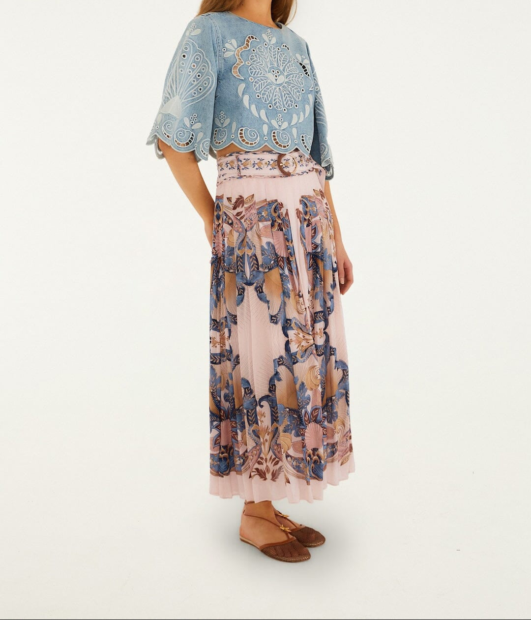 Farm Rio Soft Pink Sea Garden Scarf Pleated Maxi Skirt