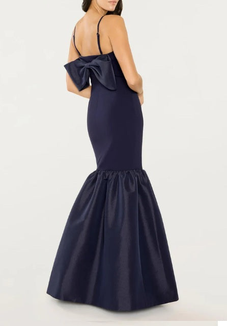 The Morgette Gown is a sophisticated floor-length mermaid dress that beautifully flatters your figure. Featuring a luxurious satin bottom and an elegant bow at the back, this gown boasts eye-catching details, perfect for making a memorable impression at any exclusive event.
