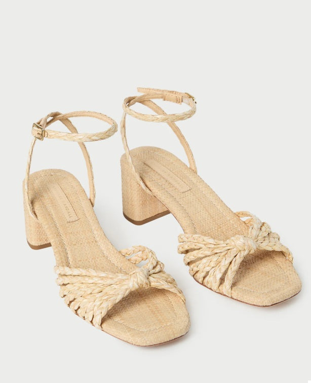 Knotted mid-heel sandal in natural straw. Features braided, pieced mignon straps, a tonal sole, an open toe, and an adjustable ankle strap. 2-inch heel.