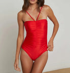 The Aubrey swimsuit features textured shirring that flatters every figure and fully removable straps that allow for a customizable look. Now in bright red.