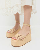 Lattice platform sandal in natural raffia. Features a padded footbed, an open toe and an adjustable ankle strap with gold buckle. 2-inch platform.
