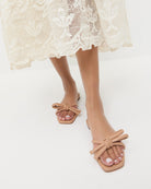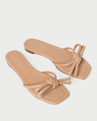 Flat slide sandal with knotted bow detail in dune nappa leather. Features a padded footbed with gold stamped logo, tonal stitching, and an open, square toe. Slips on.