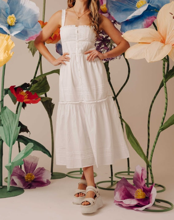 • Run free in our new Doria Dress! She buttons down with elastic straps and many lace trim and pintuck details. Doria is the perfect white summer dress.