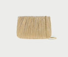 Flat pleated pouch in gold lamé. Features a removable twisted gold metal chain strap, frame closure, full lining, and interior card slot.