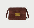 Shoulder bag in espresso brown wide woven suede. Features a slim strap, push lock closure, full lining, and gold stamped logo.