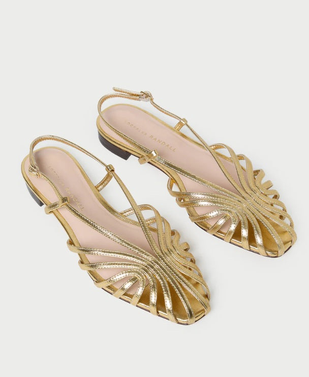 Flat sandal in gold metallic leather. Features a latticed strap design, an adjustable slingback strap with a buckle closure, and a padded footbed with a gold-stamped logo.