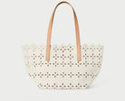 Tote bag in natural canvas with eyelet lace detailing. Features vachetta leather shoulder straps, a magnetic closure, an interior card slot, and an exterior leather stamped logo.