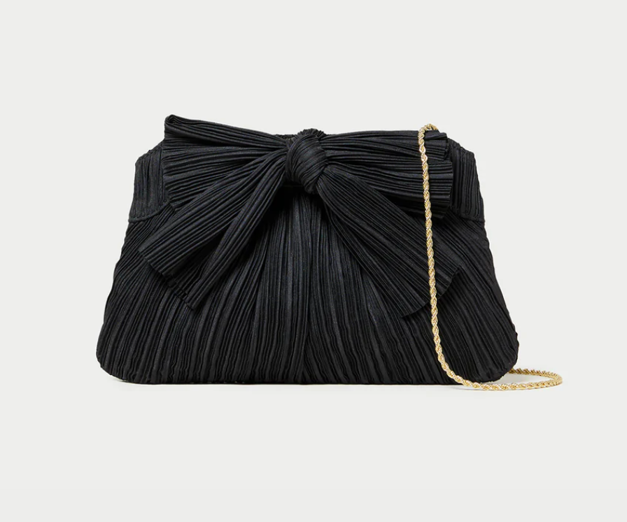 Pleated frame clutch in black fabric topped with our signature knotted bow. Features a removable twisted gold chain crossbody strap, frame closure, full lining, and gold stamped logo.