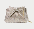 Pleated frame clutch in champagne-hued Italian lamé topped with our signature knotted bow. Features a removable twisted gold chain crossbody strap, frame closure, full lining, and gold stamped logo.