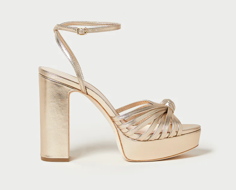 Knot heeled platform sandal in metallic champagne nappa leather with a pieced mignon strap. Features a covered leather platform, an open toe, and an adjustable buckle ankle strap. 5 inch heel, 3.5 inch platform.