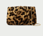 Gathered flat clutch in leopard Italian velvet. Features a removable metal chain strap, frame closure, full lining, and an interior metal logo plaque.