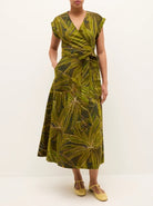 With sophisticated practicality and a customizable fit, this classic wrap dress is endlessly versatile and universally flattering. This season, Polly leans into that elegant aesthetic in Canopy, a deep olive-green palm print. Bonus: It has pockets!