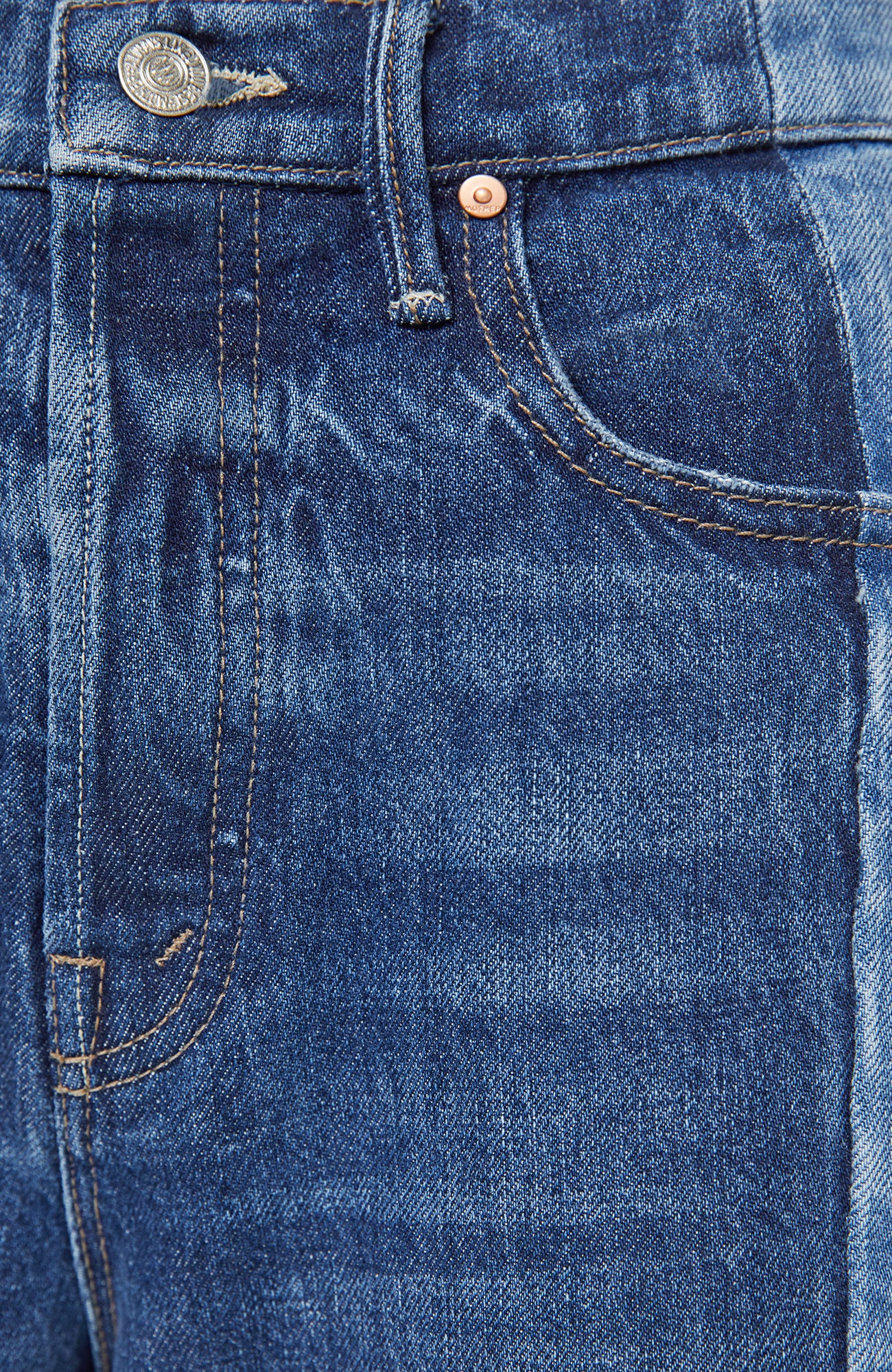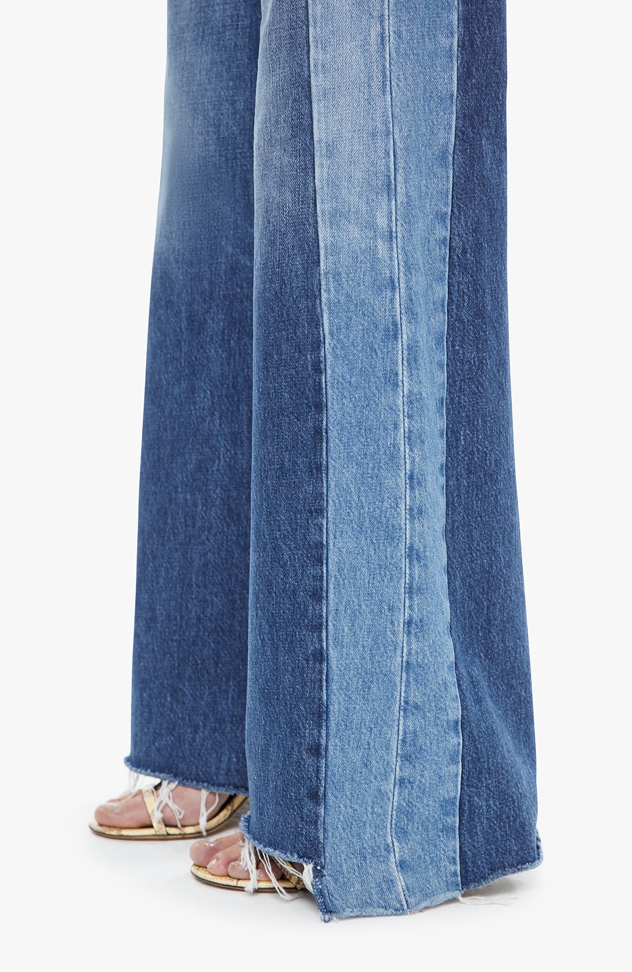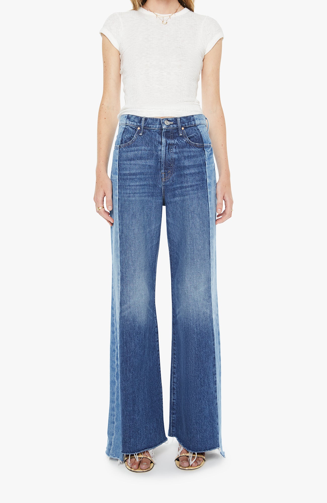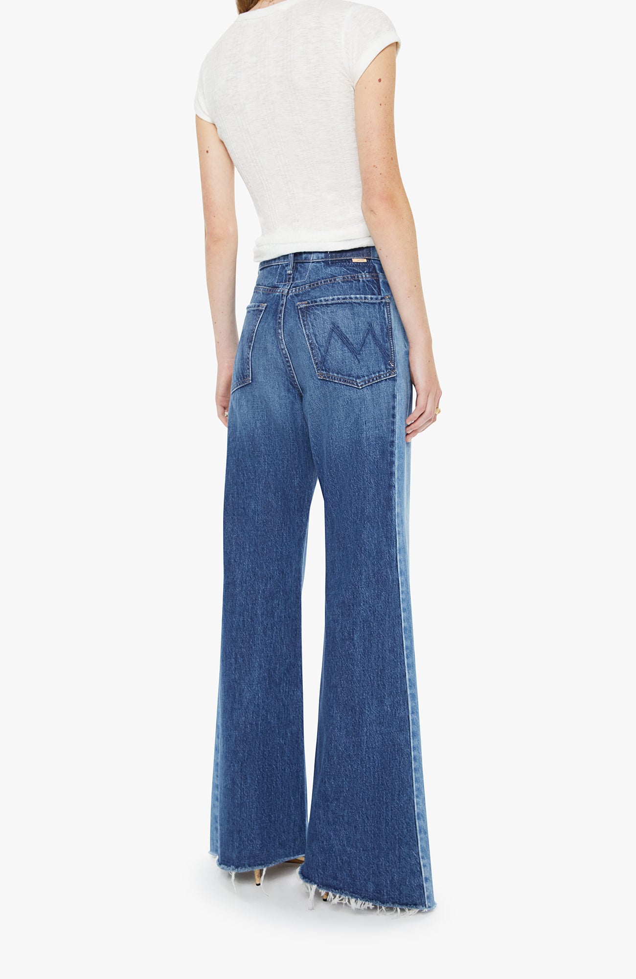 High-waisted wide-leg jeans with a button fly, long 32-inch inseam and a frayed, uneven hem. Made from rigid SUPERIOR denim, Double Take is mid blue with whiskering, fading and lighter panels down the outer leg. These jeans are rigid and take time to break in.