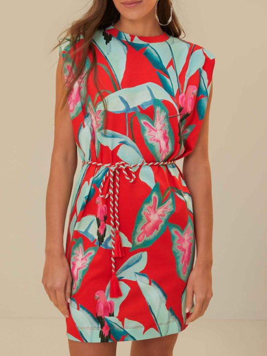 Farm Rio Red Summer Foliage Organic Cotton Mini T-Shirt Dress