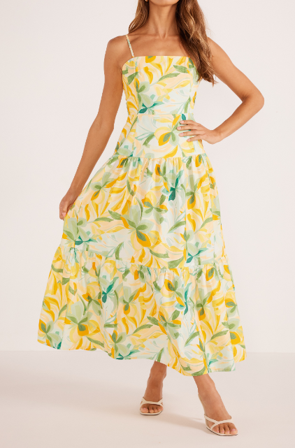 MinkPink Solstice Tiered Midi Dress - Yellow Palm Print