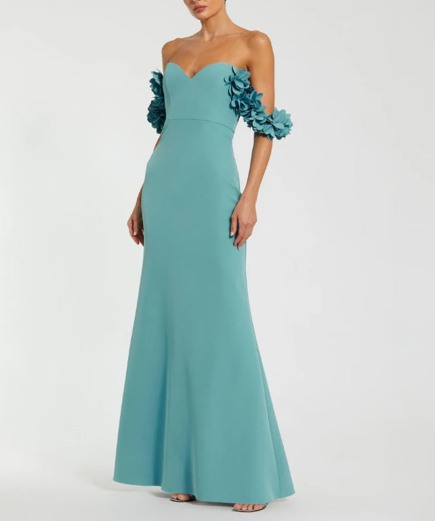 Mac Duggal Crepe Off The Shoulder Gown With 3D Flowers - Teal Blue
