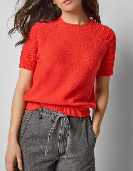 The Textured Sleeve Sweater is knit in an eco-friendly cotton boucle with a touch of stretch. The lightweight jersey stitch keeps it easy and comfortable, while the boucle yarn adds subtle texture throughout. Raglan sleeves and a short sleeve silhouette make it perfect for layering or wearing on its own. A unique stitch detail on the sleeves adds just enough interest to this simple shape.