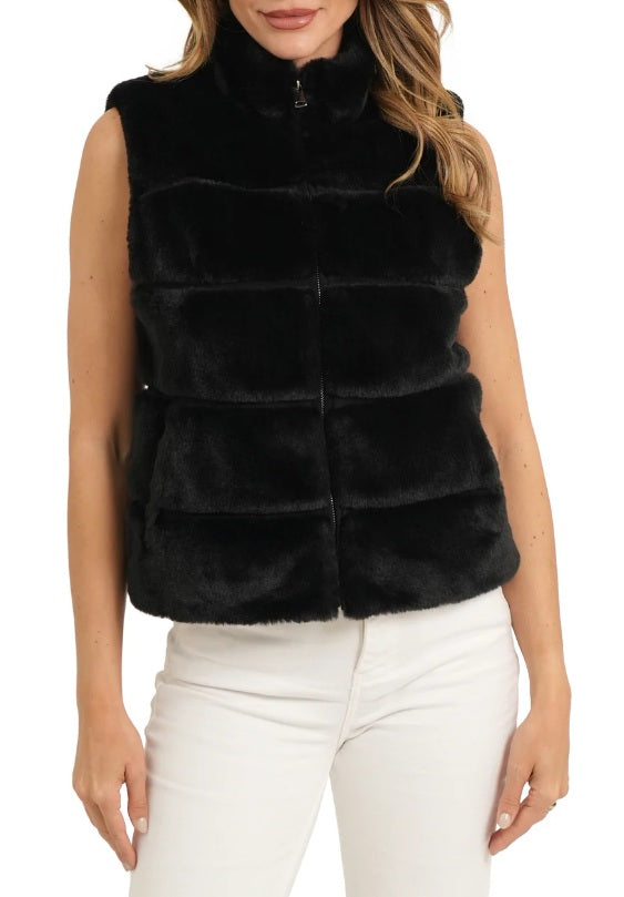 Vince faux fur vest, stand collar, zip front closure, slit pockets on front, hem lands at hip, relaxed fit.
