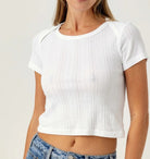 An update to our best-selling Brother Tee, the Pointelle Baby Brother Tee is crafted from a new 100% cotton pointelle fabric, offering a new take on a classic silhouette. It features an overlapping shoulder yoke detail and soft cap sleeves. Finishes right at the belly button with a size small length measuring 16.5in. Complete with a crew neckline, it’s the perfect everyday essential with a delicate touch.