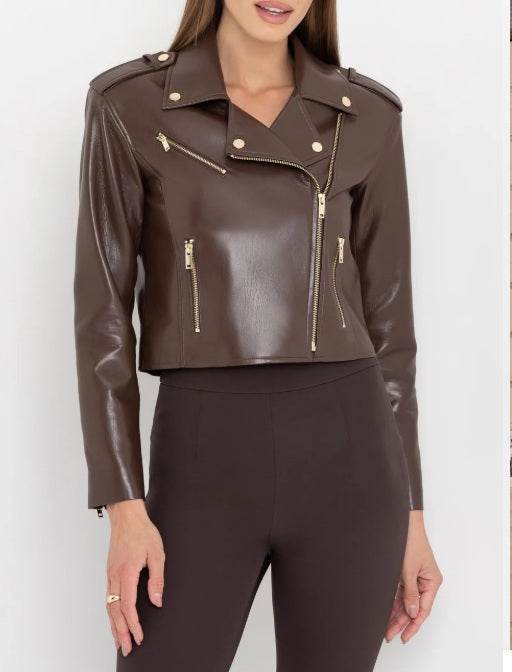 A modern classic, redefined. The Cosita Jacket is cut from ultra-smooth stretch vegan leather in a rich mahogany hue and features a cropped, boyfriend-inspired fit with bold moto styling. Gold hardware adds polish to the asymmetric front, zip cuffs, and angled pockets. Throw it over a tee, dress, or knit — this jacket brings instant cool to every outfit.