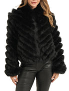 Ginger reversible faux fur jacket, removable hood, zip front closure, front pockets, relaxed fit.