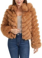 Ginger reversible faux fur jacket, removable hood, zip front closure, front pockets, relaxed fit.