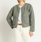 Meet the perfect goes-with-everything layer for crisp, breezy days. This 100% cotton quilted jacket has a boxy, cropped fit, pockets, and button snaps up the center. This one comes in Castor Grey.