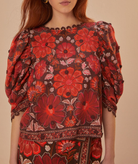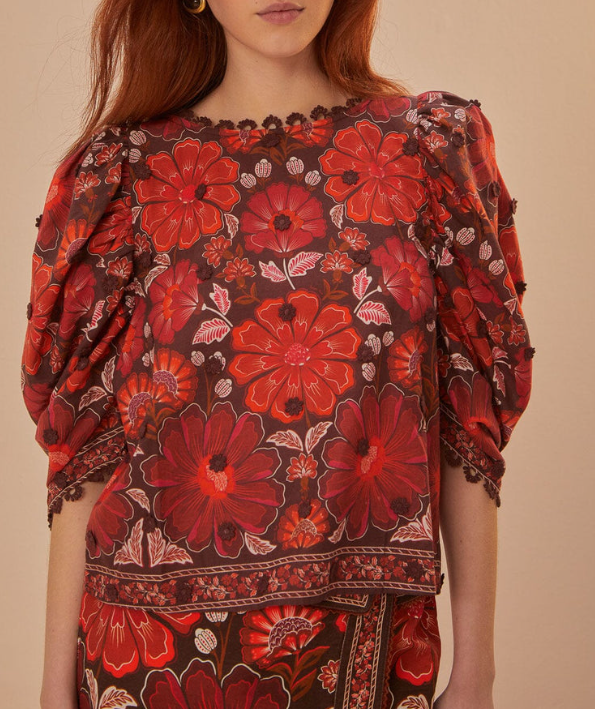 The Gigi Tapestry Brown Blouse is a true embodiment of FARM Rio's enchanting aesthetic, featuring a warm palette of rich browns and deep reds in a captivating tapestry floral print. The elegantly crafted high neckline and gently puffed sleeves converge to create a silhouette that's both timeless and whimsical. With an alluring play of patterns that frame the form, this blouse is a piece that promises to turn heads and warm hearts.