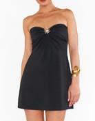 This strapless mini is here to solve all your vacay wardrobe dilemmas! Made from a sleek black slinky material and featuring a playful sun brioche pin at the front, it’s your go-to for hot nights on the town. Just add heels and some gold accessories, and you’ve got a look they won’t be able to take their eyes off!