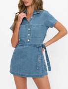 Meet the Stateside Romper, your denim go-to with a twist! This one-piece wonder features a partial button front and a built-in wrap skort for an easy, pulled-together look. It’s laid-back but polished, perfect for wherever your day takes you - just add sneakers or cowboy boots and you're out the door!